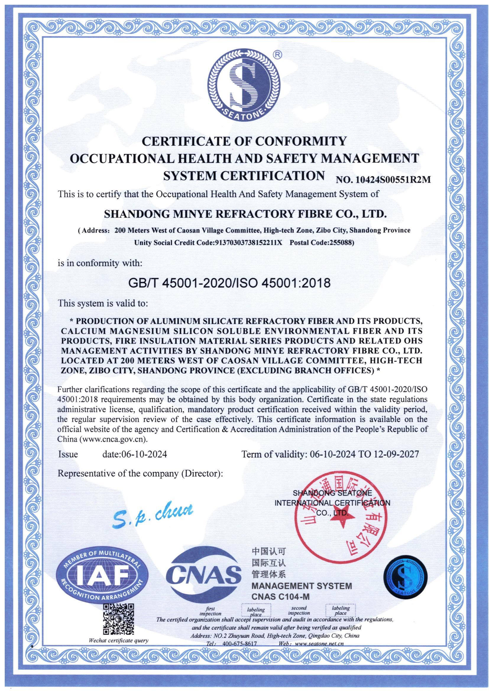 2024年職業健康體系認證證書