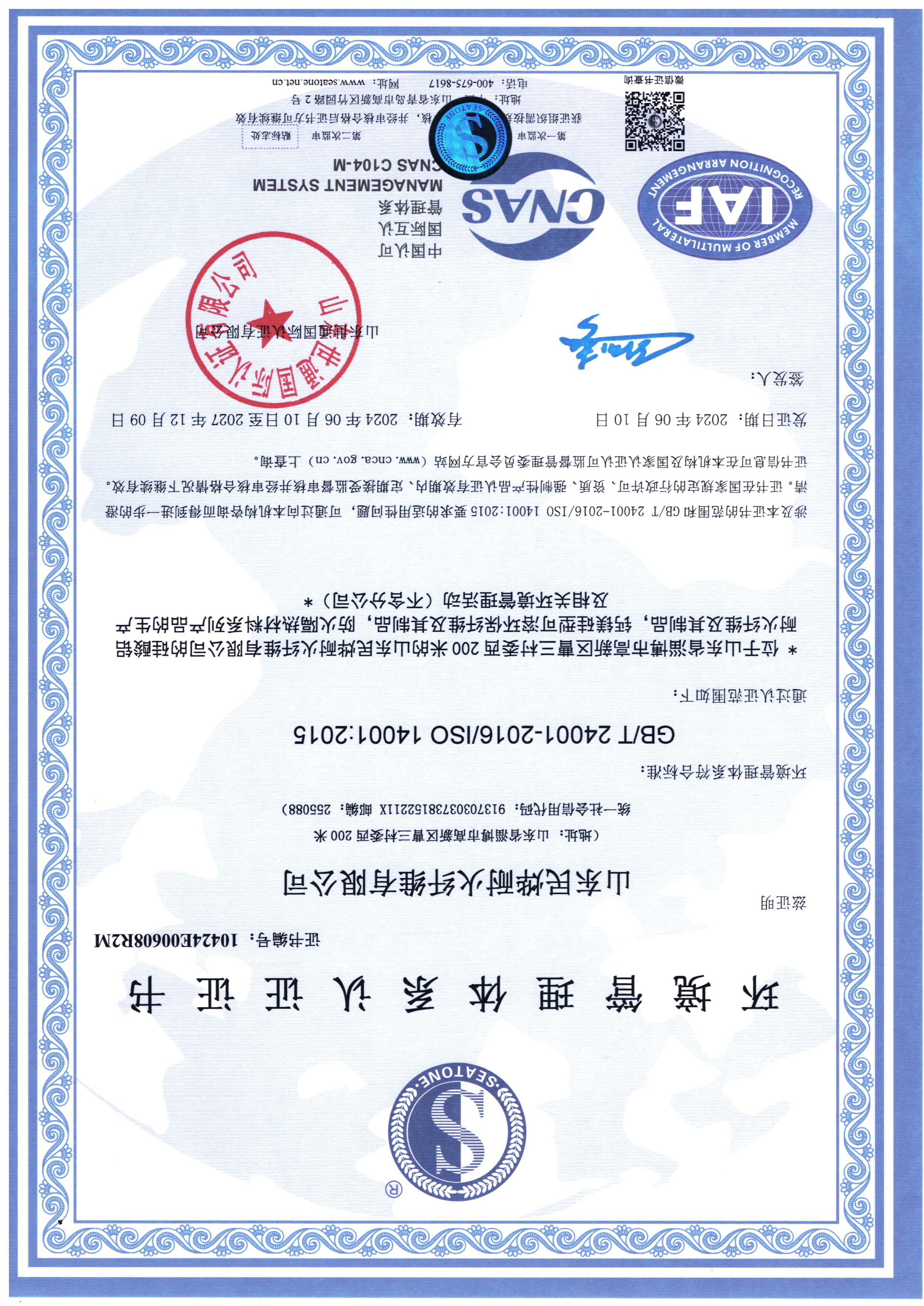 環境管理體系認證證書